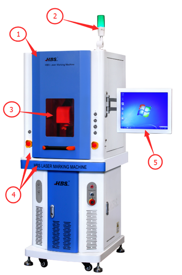 ② Luz de advertência: a luz de advertência tem três funções: quando a máquina estiver pronta para a marcação ou o procedimento de marcação for concluído, a luz ficará verde;quando a máquina estiver em operação ou marcação, a luz ficará laranja ou amarela;quando a máquina não está fechada corretamente (alguém abre a porta quando a máquina está funcionando), ou a máquina não é segura, a luz fica vermelha e também soa um alarme.